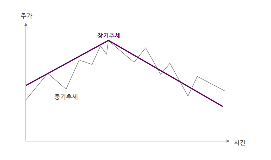 - 1차 추세(장기): 몇 달~몇 년간 지속되는 시장의 주된 움직임