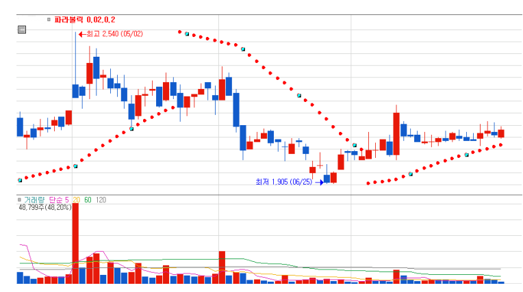 (위 지표에에서 붉은 점선들이 따라 파라볼릭 지표를 뜻 합니다. 여타 지표들과는 달리 포물선 형태를 띄우고 있습니다.)