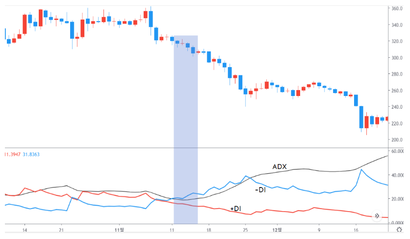 반대로 -DI가 크다면 하락 강도가 강하다는 것을 의미하고 -DI가 작다면 하락 강도가 약하다는 것을 의미합니다.