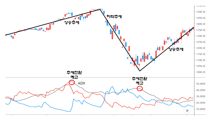 아래그림 이때 ADX가 하락 추세를 보이면 가격 추세 변화 가능성이 큽니다.
