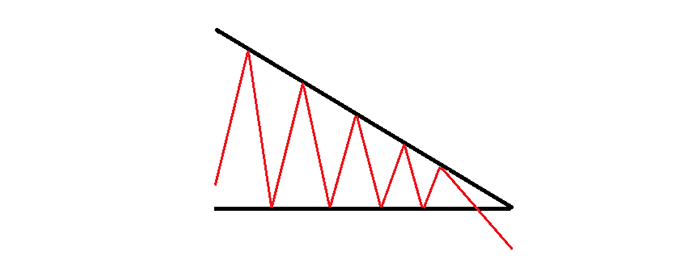 이 경우 저점은 균일한 가격 지지선을 나타내고 고점은 패턴이 진행됨에 따라서 점차적으로 낮은 저항을 보여주고 있습니다. 추세선 부근에 지지선이 있을 경우 형성되는 하락패턴이며 하단 추세선 돌파 시 매도 포지션을 진입하는 경우입니다.
