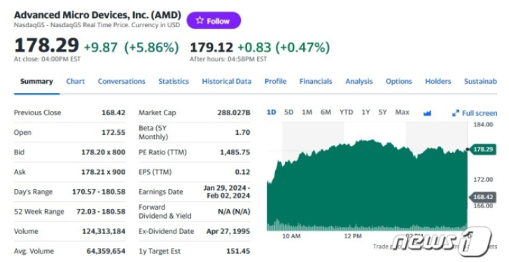 24일(현지시간) 뉴욕증시에서 AMD는 전거래일보다 5.86% 급등한 178.29 달러를 기록했다.