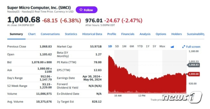 18일(현지시간) 뉴욕증시에서 슈퍼 마이크로는 전거래일보다 6.38% 급락한 1000.68달러를 기록했다.