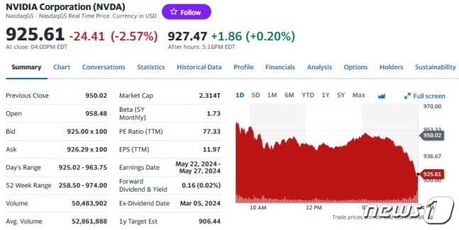 일단 엔비디아가 2% 이상 급락했다. 이날 뉴욕증시에서 엔비디아는 전거래일보다 2.57% 급락한 925.61달러를 기록했다.