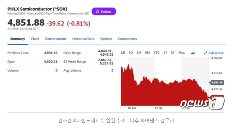 26일(현지시간) 뉴욕증시에서 필라델아반도체지수는 전거래일보다 0.81% 하락한 4851.88포인트를 기록했다.