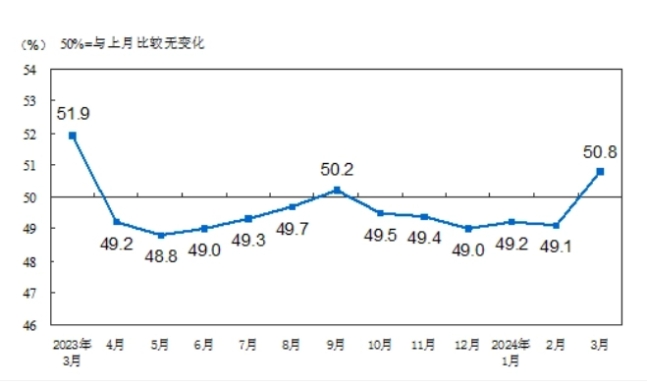 중국 국가통계국은 31일 3월 제조업 PMI가 50.8포인트로 전월(49.1) 대비 1.7포인트 상승했다고 밝혔다. 이는 기준점 50은 물론 시장 평균 전망치 49.9를 넘어선 것이다. 3월 서비스업과 건설업을 포함한 비제조업(서비스업) PMI도 전월(51.4)보다 1.6포인트 높은 53으로, 지난해 9월 이후 최고치를 기록했다.