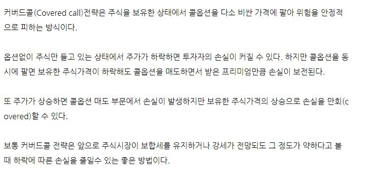 투자자는 횡보 장세 또는 완만한 상승장이 예상되는 경우 커버드콜 전략을 통하여 안정적인 수익을 노려보실 수 있습니다.