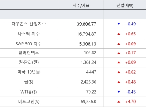 S&P500은 사상 최고 경신 코앞까지 갔다. 4.86p(0.09%) 오른 5308.13으로 강보합 마감했다. 15일 기록한 사상 최고치 5308.15에 2p 못 미친 수준으로 장을 마쳤다.